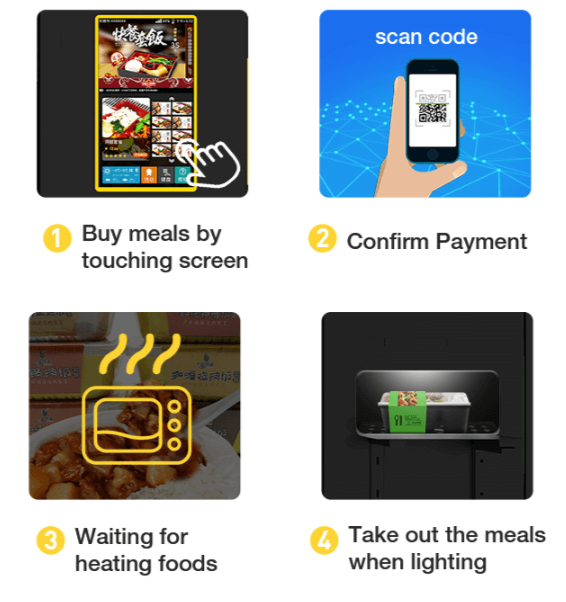 21.5" touch interface simplifies ordering: Touch meal → Confirm payment → Heat → Collect with indicator lights.
